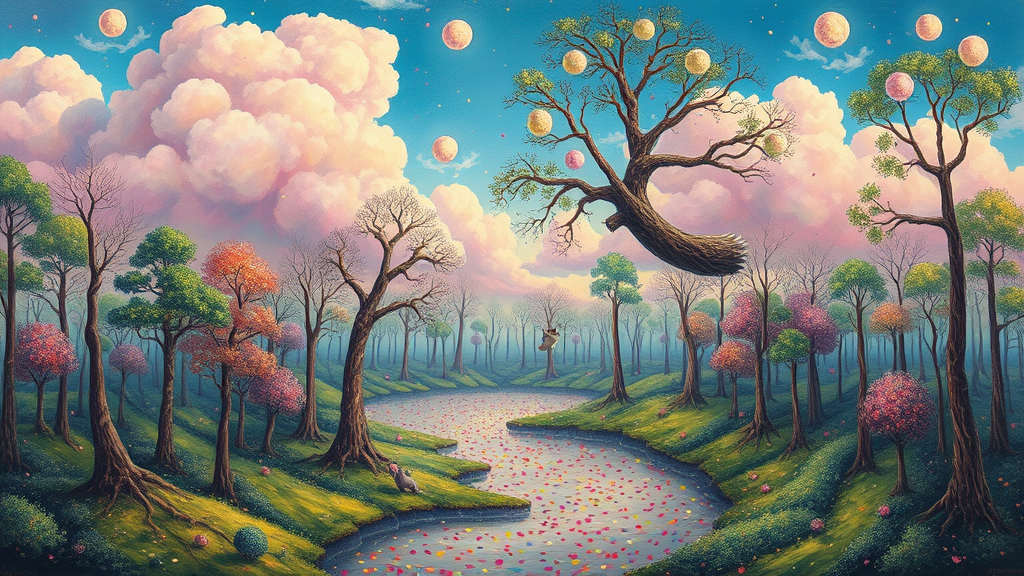 A surreal oil painting of an enchanted forest reveals bubblegum clouds drifting above a mystical woodland where confetti-filled rivers meander through the scene. In this bizarrely interdimensional landscape, floating tree men hover silently, their presence both mesmerizing and strange. The air is alive with hilariously enchanting vibes as polka-dotted squirrels frolic through the trees. The vibrant colors shift with the whims of a color-changing paint palette, evoking a sense of wonder at the chromatic play of light. The composition, inspired by the flower of life, captures the vastness of the scene through an ultra wide angle lens that immerses the viewer in this otherworldly realm.
