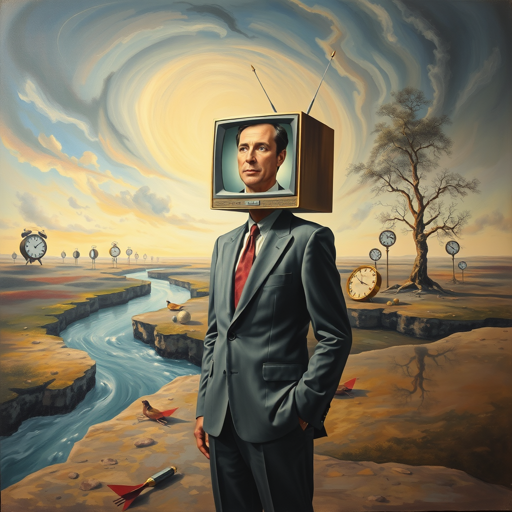 A surreal painting depicting a figure with a television for a head, standing in a vast, dreamlike landscape. On the TV screen flickers the man's own visage, its expression shifting subtly as if he is lost in thought. The background is a blend of swirling skies and abstract shapes, where clocks melt into the horizon and trees grow clocks instead of leaves. Nearby, a river flows upwards into the sky, reflecting the scene in its mirror-like surface. The figure wears a suit that blends into the shifting patterns of the landscape, adding to the sense of unreality and mystery.