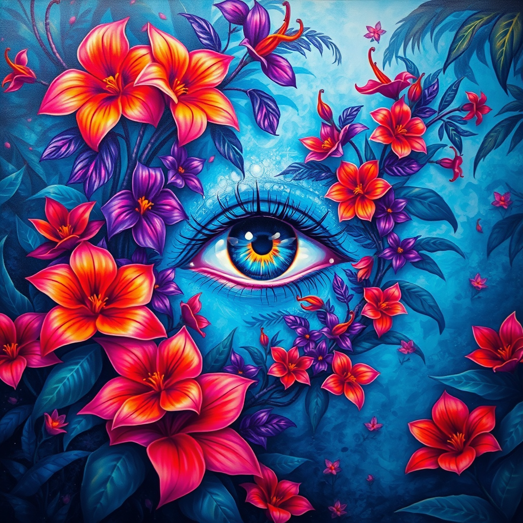 A surreal painting of a mystical eye surrounded by vibrant purple and orange flowers, reminiscent of James Jean's intricate style, set within a mysterious jungle landscape. The composition is infused with Martin Ansin's dynamic flair, capturing the essence of Papua New Guinea art. The colors blend harmoniously in light blue and bold red, creating a vivid, almost ethereal atmosphere. The artwork is designed as a striking 32k UHD poster with a unique aspect ratio of 37:61, exuding an enchanting and enigmatic vibe, with an added touch of dreamlike wonder.
