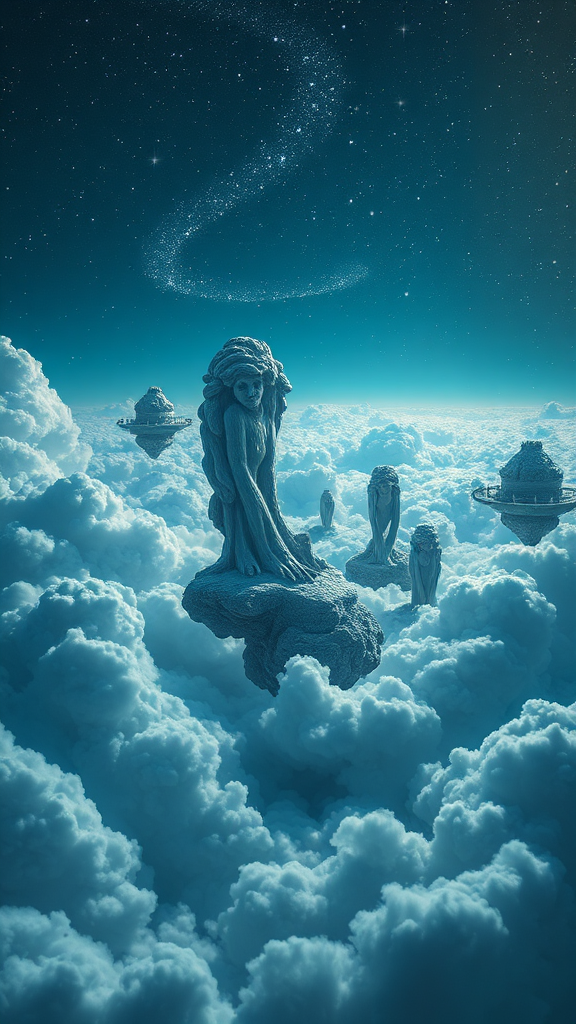 A surreal photo illustration depicting a world nestled among the clouds, inspired by the artistic styles of Tanya Shatseva, the Stars Art Group, and Meghan Howland. The scene is imbued with the deep tones of dark indigo and light cyan, featuring mind-bending sculptures that defy gravity. The visual captures realistic hyper-detail, juxtaposed with a fluid simplicity that draws the observer into its ethereal landscape. The sky is peppered with twinkling stars, casting a magical glow over sweeping cloud formations, inviting the viewer to explore this dreamlike realm.