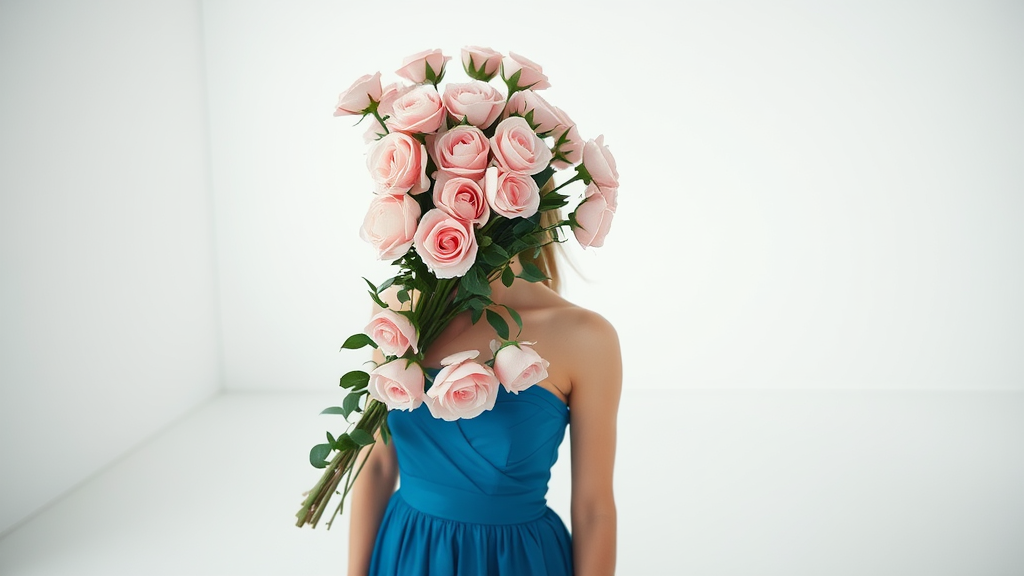 A surreal photograph featuring a woman in an elegant blue dress, her head entirely obscured by a bouquet of pink roses, set against a pristine white minimalist room devoid of furniture. The scene is captured in high detail, highlighting the delicate textures of the petals and fabric. The atmosphere is serene and ethereal, with soft, diffused lighting that enhances the tranquil, dreamlike quality of the image.
