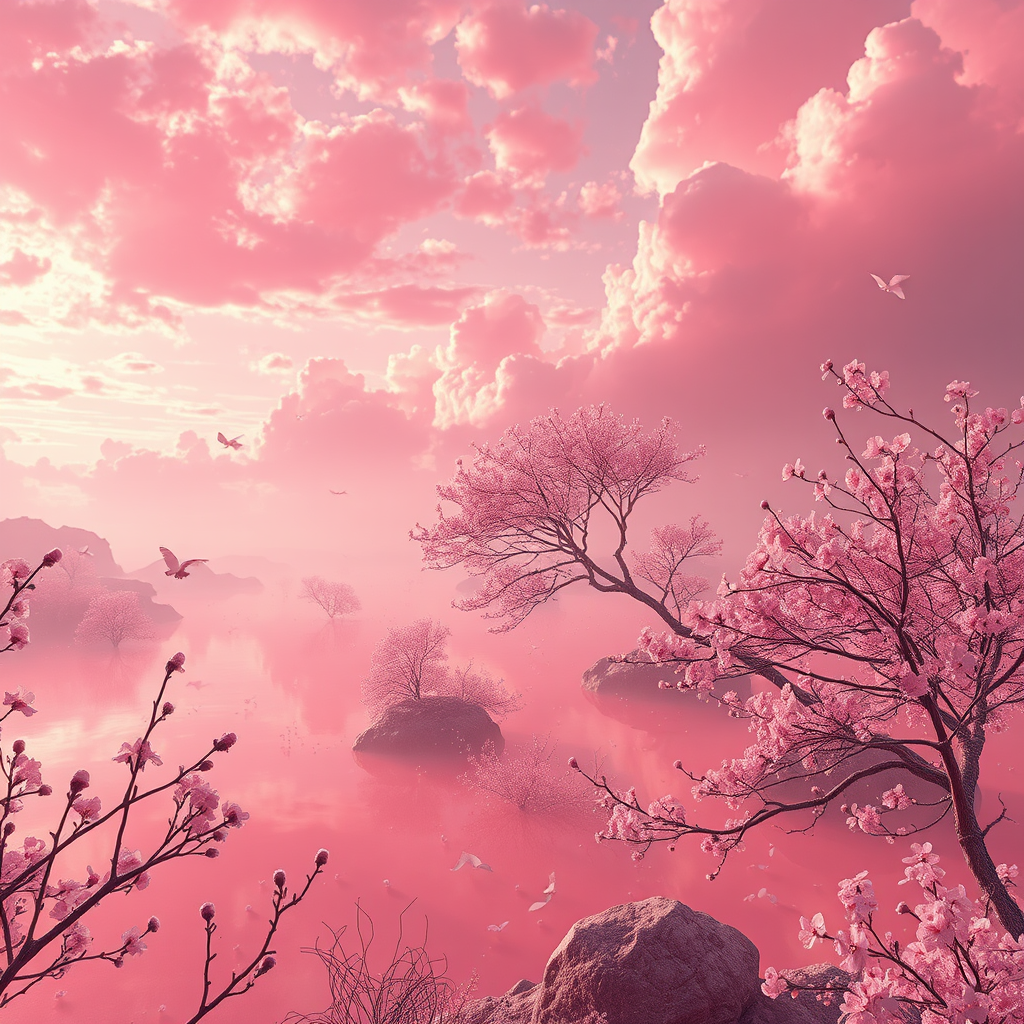 A surreal pink landscape enveloped in a rich tapestry of pink hues, featuring dramatic atmospheric lighting that cascades through the scene. The setting evokes a dreamlike quality with the sky reflecting shades of rose and blush, reminiscent of the stunning visuals found in the works of Makoto Shinkai, Stanley Artgerm Lau, WLOP, and Ross Draws. The environment is bathed in a soft, ethereal light, casting gentle shadows and creating a harmonious blend of warm pink tones. Intricate details adorn the scene, with delicate pink blossoms scattered throughout and a tranquil pink-hued body of water that mirrors the sky's brilliance. The composition maintains a perfect balance, capturing the enchanting essence of a world washed in pink.
