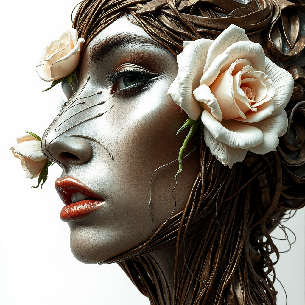 A surreal portrait of a woman adorned with roses elegantly perched on her nose, crafted in a mesmerizing style of liquid metal cascading over layered fabrications. This piece draws inspiration from the intricate details of Nicola Samori and Brian Jungen, with the exquisite finish reminiscent of Leo Putz's touch. The composition contrasts light silver against deep, lustrous brown hues, creating a dynamic interplay of textures and tones. The artwork exudes a raw, unpolished allure, capturing a sense of otherworldly beauty and intricate craftsmanship.