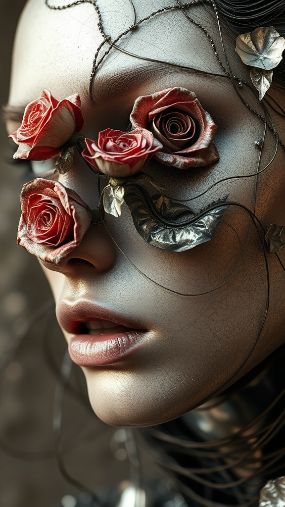 A surreal portrait of a woman, her features adorned with roses blossoming from her nose, crafted as if forged from liquid metal. Layered metallic textures and abstract fabrications intertwine in exquisite detail, inspired by the ethereal aesthetics of Nicola Samori and Brian Jungen. The composition echoes the delicate precision of Leo Putz, rendered in harmonious shades of light silver and dark brown. The artwork evokes a sense of fluid elegance and raw emotion through its intricate, layered style.