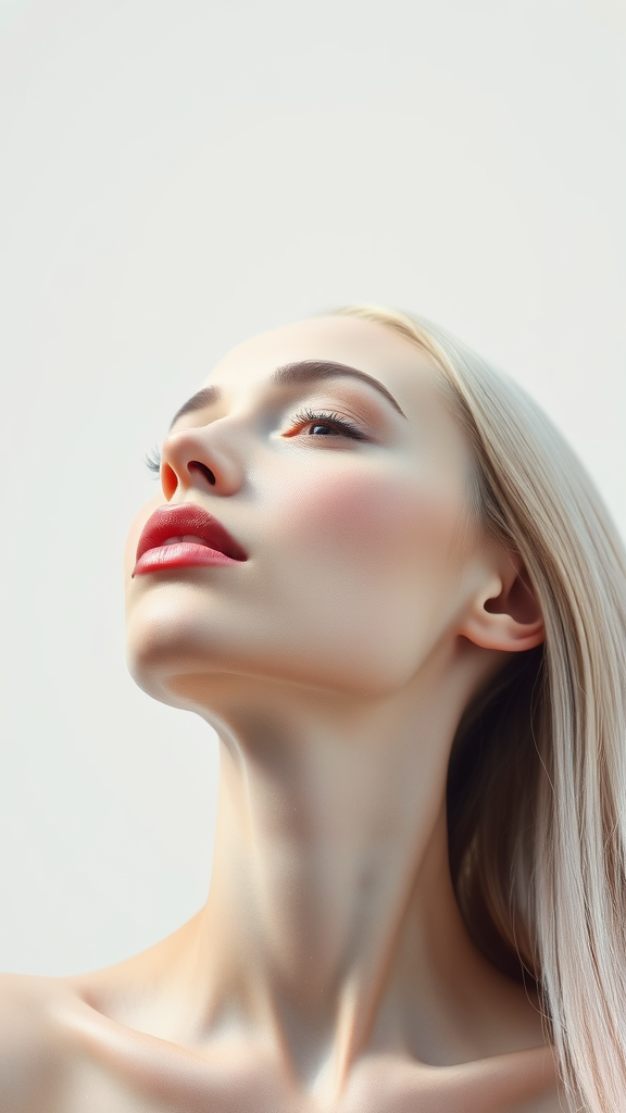 A surreal portrait of a woman with her head dramatically tilted back against a stark white background, her elongated hair cascading around her in smooth, flowing lines. Her facial features, exaggerated yet harmonious, create a symphony of curves and elegance. Her skin emits an ethereal glow, accentuated by an array of pastel shades—soft pinks, gentle blues, and muted purples—blending seamlessly to craft a serene, otherworldly atmosphere. Intricate details bring out the photorealistic nature of the piece, capturing every nuance in 4K UHD. A delicate shimmer subtly dusts her features, enhancing the dreamlike quality while maintaining a raw, unfiltered style.
