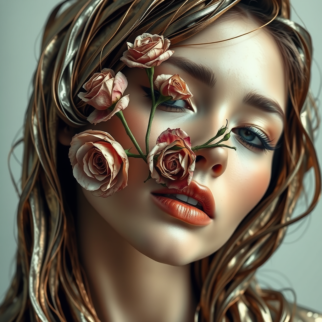A surreal portrait of a woman with roses delicately perched upon her nose, crafted in the style of fluid metallic forms intertwined with intricate layered fabrications. The artwork draws inspiration from the evocative techniques of Nicola Samori and the imaginative creations of Brian Jungen. The image exudes exquisite detail reminiscent of Leo Putz’s touch, captured in a harmonious blend of light silver and deep brown hues. The overall composition is a striking balance of abstraction and realism, featuring raw, unfiltered textures and a dreamlike aura.