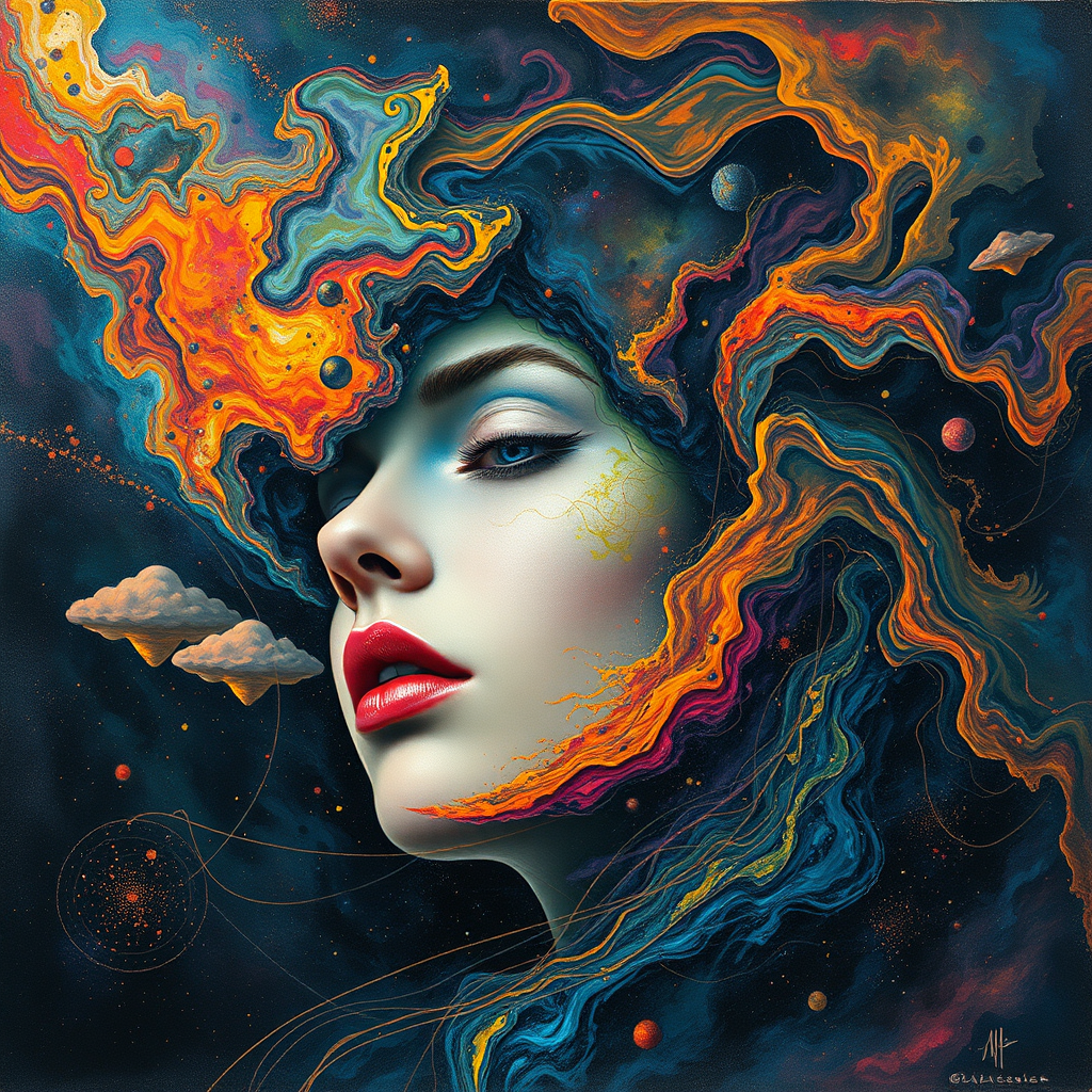 A surreal portrait of a woman's head enveloped in a cosmic landscape, swirling vibrant colors blend in an Aleksi Briclot style, echoing Peter Mohrbacher's celestial visions. The scene bursts with intensely colorful figuration and realistic hyper-detail, as if woven together with splattered and dripped elements, creating a tapestry of ethereal beauty against a backdrop of the universe, capturing the infinite wonder within a 63:128 aspect ratio and heightened stylistic flair.