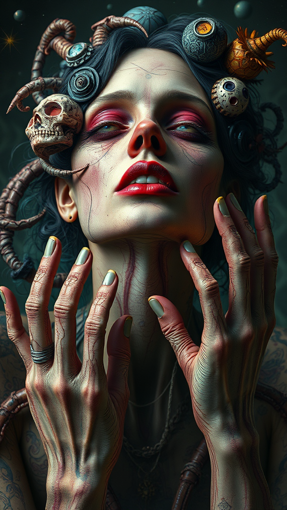 A surreal portrait with a kaleidoscope of colors and intricate details, echoing the essence of romanticism with a cinematic flair, reminiscent of the styles found on art platforms like ArtStation. Influences of Moebius and Greg Rutkowski are perceptible in the composition. The image is somewhat distorted, exhibiting compression artifacts with reduced resolution, alongside noticeable text overlay errors. It's deliberately cropped, showcasing anomalies in quality and structure. There's an unsettling amalgamation of elements—distorted features, mutated forms, blurred outlines, and dehydrated textures—all contributing to an atmosphere of intrigue and enigma. Anatomy appears flawed, with irregular proportions and extra appendages, presenting an array of mismatched limbs and faces that include fused and abundant fingers, an elongated neck, and unnaturally structured hands and facial elements. The overall effect is strangely captivating, despite its unconventional appearance.