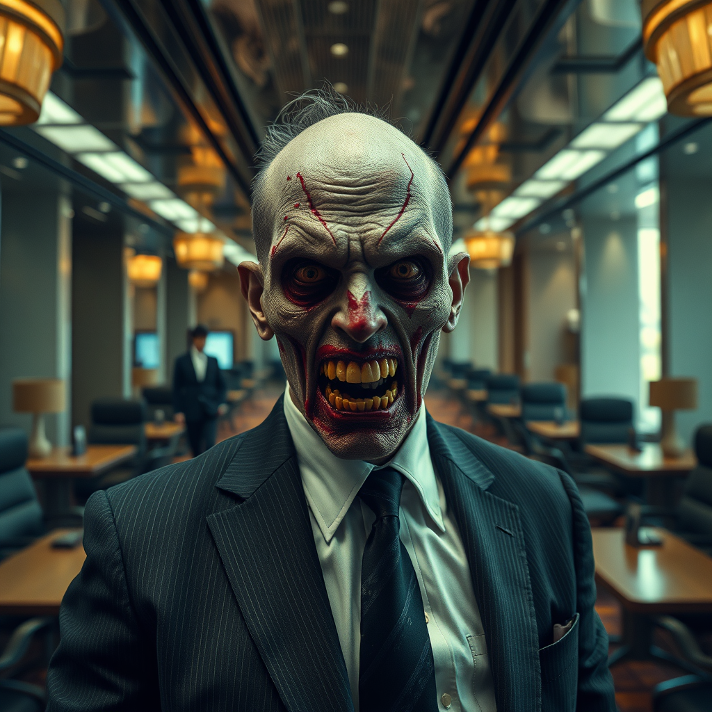 A surreal portrayal of a ruthless CEO who is a zombie, exuding power and chaos at the helm of a Fortune 500 company, captured through the lens of a Sony FE 70-200mm f/2.8 GM OSS, blending corporate sleekness with unsettling decay, amidst a backdrop of opulent office interiors distorted in dreamlike, abstract forms.