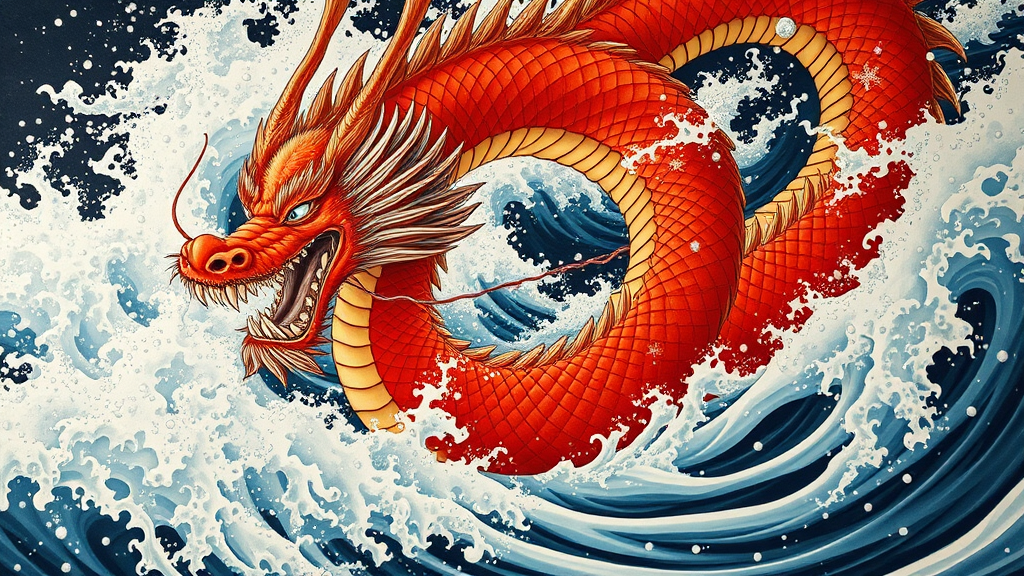A surreal red dragon weaving through tumultuous ocean waves, captured in a neo-traditional Japanese art style reminiscent of kōji morimoto, with the intricate detail and fantastical elements of John Blanche. The scene is portrayed as a grand mural, embodying the majestic craftsmanship of wall drawings, where bold, vibrant colors bring life to the composition. In the style of Tyler Walpole, the piece features intense close-ups that highlight the dragon's scales and the swirling water, blending elements of absurdism with an awe-inspiring focus. The artwork evokes a sense of dynamic motion and mythological wonder.