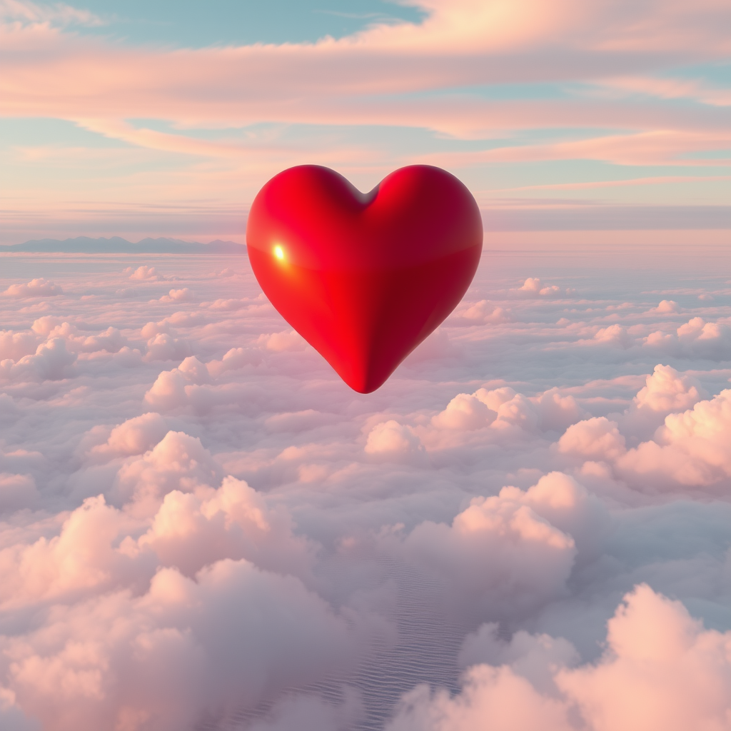 A surreal red heart floating majestically among wispy clouds above a serene stretch of water, emanating a soothing glow of light pink and sky-blue hues, evoking a sense of unbelievable beauty as if captured in a hyper-realistic scene crafted by ZBrush and rendered with the breathtaking precision of Unreal Engine 5, reminiscent of an awe-inspiring NYC skyline, exploding with emotion, in the style of Robert Bissell, intricate and dream-like, infused with a touch of magic and wonder.