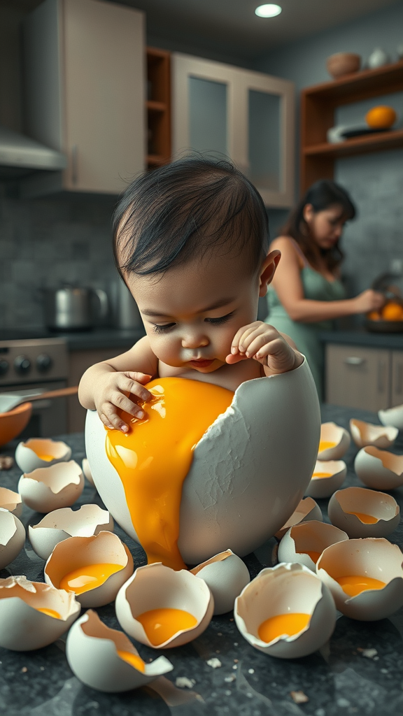 A surreal scene depicting a large-headed baby with the face of an Indonesian adult man, who is emerging from a freshly cracked egg, clutching the rim as golden yolk cascades. The setting is a bustling kitchen where a woman is intently cooking, surrounded by several equally large broken eggshells scattered across the countertop. The atmosphere is rich in detail, captured in ultra HD, 5k resolution, highlighting the contrasting textures of the egg and the contemporary kitchen environment. The scene has a whimsical yet realistic quality, combining the peculiar image of the adult-faced baby with the everyday act of cooking.