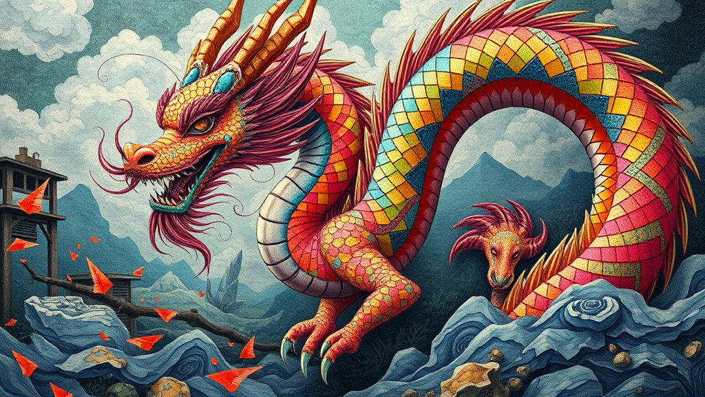 A surreal scene depicting a mesmerizing multicolored dragon, its scales a vibrant mosaic reminiscent of Natalia Rak’s vivid palette. The dragon exudes a sense of spontaneous energy, its form swirling and dynamic like hypnotic marbleized patterns. Its features are intricately detailed with fine lines and contrasts, capturing the essence of Shohei Otomo’s precise artistry. The background is a harmonious fusion of urban decay and ethereal landscapes, echoing Brian Mashburn's atmospheric style. The composition is infused with a touch of mystical symbolism, akin to hurufiyya, where abstract forms converge. Encaustic textures layer over the dragon’s serpentine body, adding depth and a tactile quality to this fantastical entity.