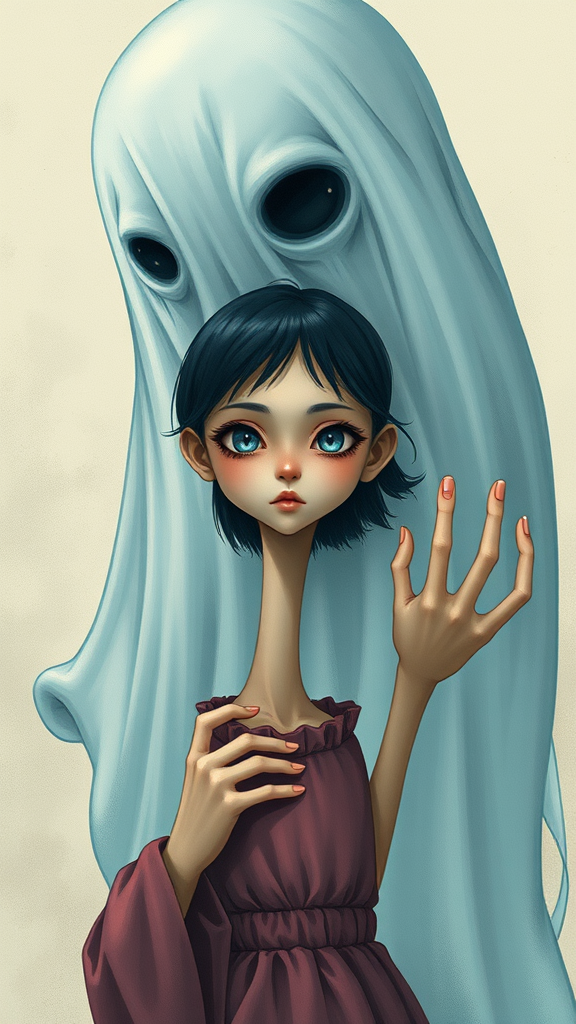 A surreal scene depicting a solitary girl alongside a gigantic ghostly figure, inspired by Chiho Aoshima's style, featuring intricate details in 16k resolution, highlighting a vibrant palette with UHD and HDR quality. The girl possesses an expression of wonder, her face intriguingly mirrored, with a playful cross-eyed gaze. Her hands display an unusual feature with extra fingers and slightly mutated forms. The composition is tightly framed to focus on the central figures, without any low-resolution distractions. The background remains abstract and ethereal, enhancing the mystical atmosphere. The image is free from any text, artifacts, signatures, or any elements that might detract from its visual purity. The girl has an elongated neck, lending an otherworldly grace, while the ghost, with its translucent presence, looms enigmatically, partially out of frame, suggesting its boundless form.