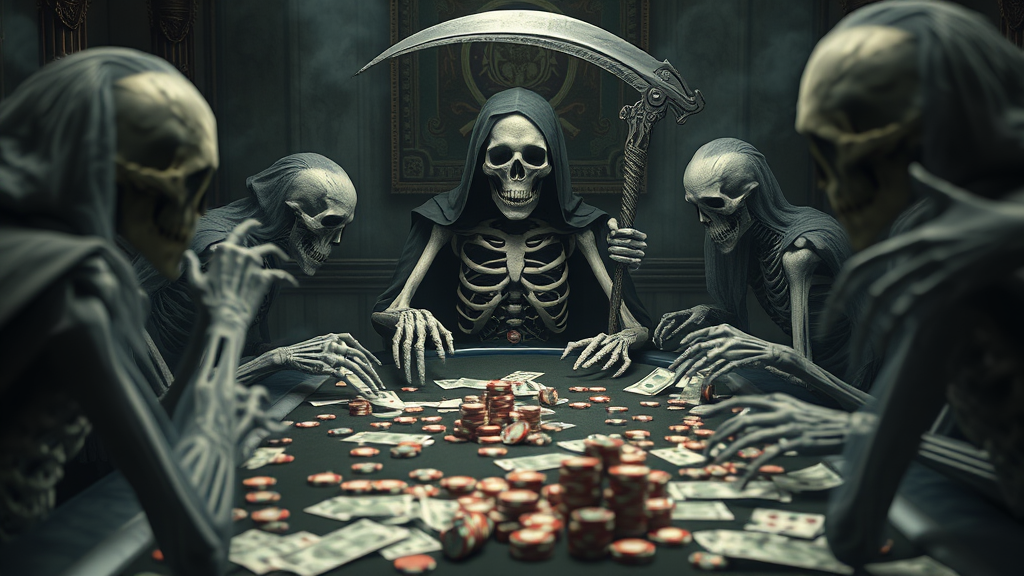 A surreal scene depicts Death engaged in a poker game, a menacing scythe looming ominously in the background. The skeletal figure gazes directly at the viewer, set within a dimly lit room. The poker table is cluttered with a chaotic array of poker chips, scattered cards, and bundles of money, enhancing the eerie atmosphere. The CGI render gives an unsettling, low-resolution appearance, plagued by distortion and digital noise. Faces and hands are disturbingly warped, featuring extra fingers and elongated limbs, contributing to the uncanny and disfigured aesthetic. The setting carries a morbid tone, with objects partially out of frame, creating a sense of incompleteness. Muted colors and blurred edges suggest deteriorating image quality with visible compression artifacts. Ghostly figures hover with elongated necks, while details are distorted, with poor anatomy and grotesque proportions adding to the nightmare. The image is devoid of watermarks, signatures, and usernames, yet retains a chaotic, macabre energy inspired by the unsettling charm and the notion of death in a twisted game of chance.
