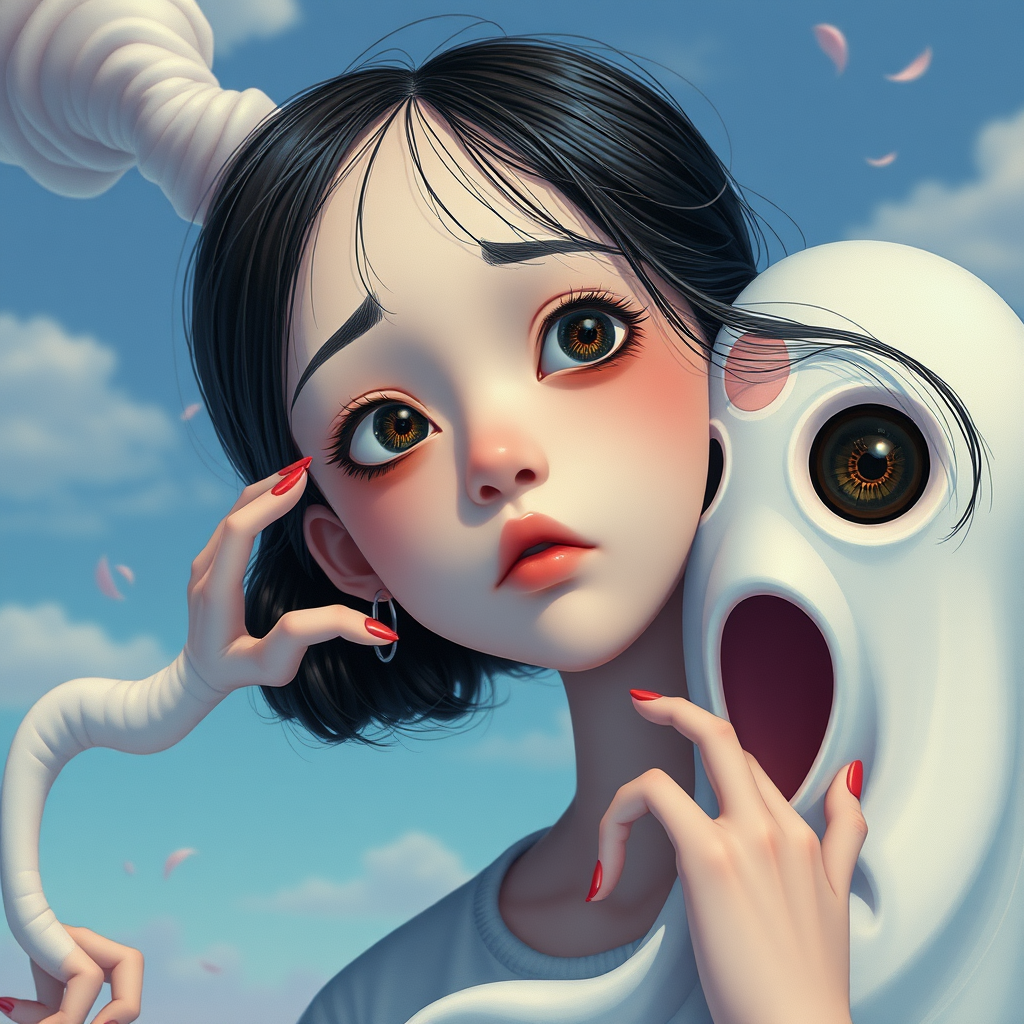 A surreal scene featuring a single girl with an oversized ghost companion, inspired by Chiho Aoshima's whimsical style, in vibrant 16k resolution with UHD and HDR elements. The girl's face appears intriguingly cloned, and her eyes exhibit a playful cross-eyed expression. Her hands and fingers are oddly contorted, suggesting mutation. The image cast in this dream-like quality displays vivid colors and intricate details, though subtly altered to lean into a fantasy realm. The composition remains clear and engaging, avoiding low-resolution or digital artifacts, while maintaining a clean aesthetic without text, signatures, or watermarks. The girl's elongated neck and parts of the scene peek out of frame, sparking curiosity. A true standalone artwork without reference to charts or multiple perspectives.
