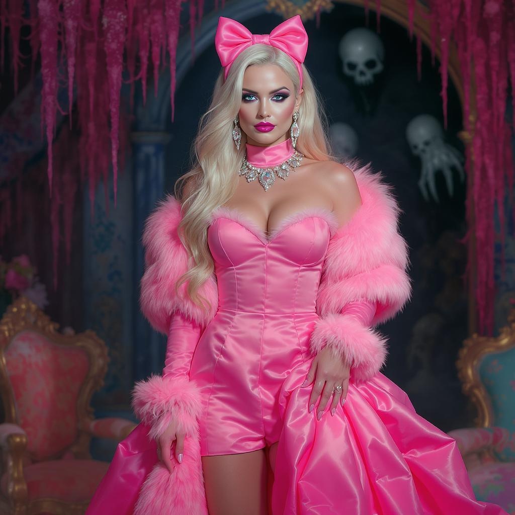 A surreal scene featuring Margot Robbie as a glamorous, otherworldly character in a vibrant pink outfit, reminiscent of Barbie's iconic style, but with a darker twist. Her expression is eerily calm and confident, evoking a mysterious allure similar to Pinhead from Hellraiser. The setting is a fusion of whimsical and unsettling elements, blending bright, playful colors with subtle hints of a hidden, unsettling dimension. The atmosphere captures a striking balance between fantasy and the macabre, creating a visually captivating and thought-provoking scene.