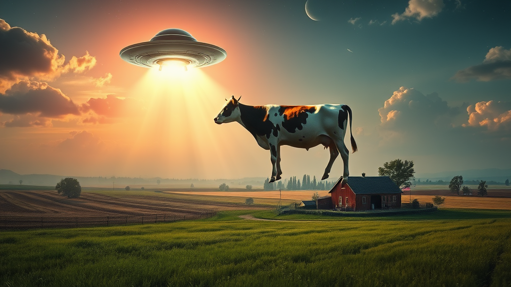 A surreal scene unfolds as a cow hovers serenely in a luminous beam, suspended beneath a mysterious UFO, casting an ethereal glow over the rural farmhouse nearby. The landscape blends photorealistic detail with dreamlike fantasy, invoking a sense of zen tranquility amidst the fields. The artwork hints at Die Brücke's bold style, merging with fictional landscapes to create an otherworldly atmosphere where reality and imagination converge. This serene yet surreal imagery captures a moment of dreamlike wonder and cosmic inspiration, inviting contemplation and curiosity.