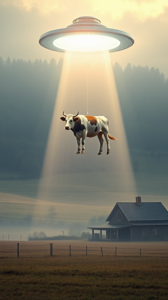 A surreal scene unfolds in a photo-realistic landscape: a cow hovers gently within a luminous beam, suspended several feet beneath a mysterious UFO. The spacecraft, with an otherworldly glow, drifts close to an old rural farmhouse nestled amidst dreamy, ethereal fields. This enchanting tableau, reminiscent of zen buddhism and die brücke influences, captures the tranquility of the countryside in contrast with the fantastical elements of the scene. The landscape, bathed in soft, transcendent light, evokes a sense of serene wonder and dreamlike imagery.