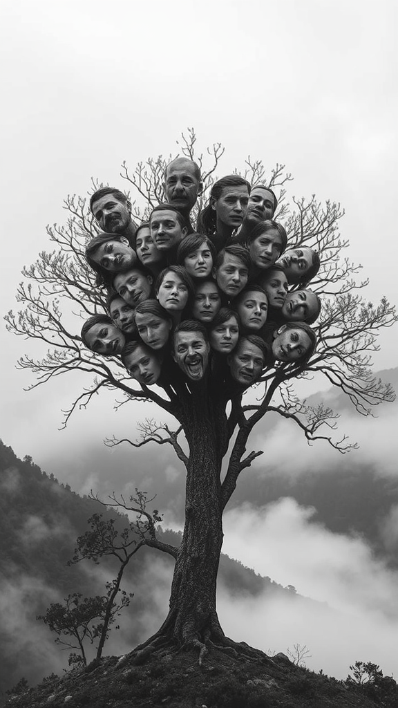 A surreal tree composed of intertwined human faces, set against a backdrop of mist-shrouded mountains, the landscape enveloped in fog, captured in stark black and white photography with a cinematic hyper-realistic touch.