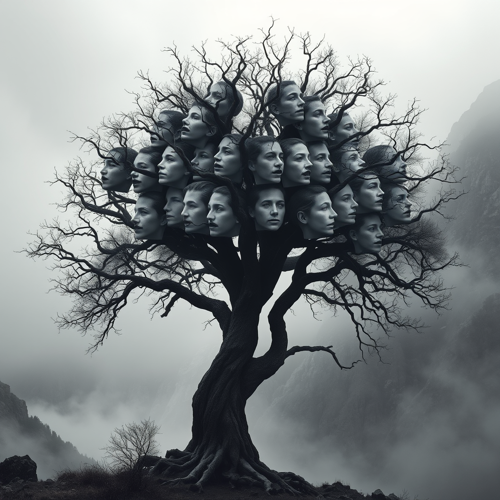 A surreal tree composed of intertwined human faces set against a foggy mountain landscape, with a mysterious ambiance enhanced by black and white photography; the scene captures a hyper-realistic, cinematic quality with a touch of darkness, as the mist weaves through the intricate branches and craggy peaks in the background.