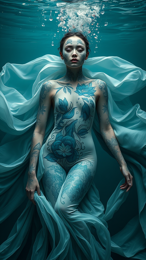 A surreal vision by Juliane Schreiner, celebrating intricate underwater realms, where flowing fabrics blend seamlessly with dark turquoise and soft whites. Bodies adorned with intricate paint resemble living canvases, decorated with ultrafine detail and nature-inspired motifs. A harmonious fusion of fluid elegance and organic artistry creates a captivating tableau in a vertical composition.