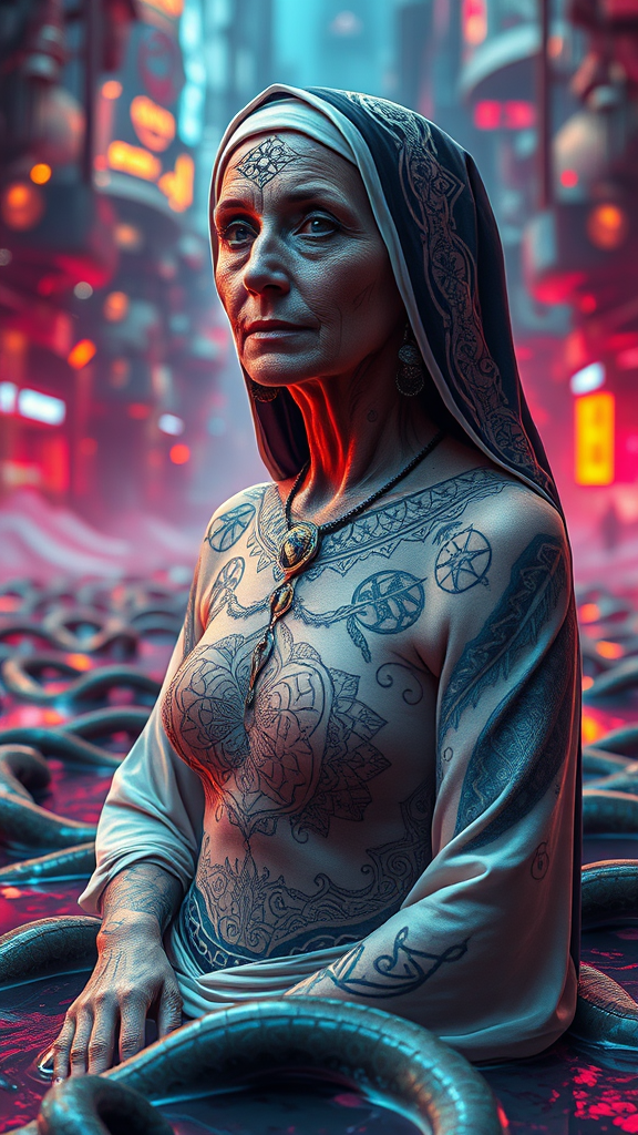 A surreal vision of an aunt adorned with intricate shamanic tattoos woven in patterns reminiscent of sacred geometry, standing amidst a backdrop of futuristic chaos. Her presence is both ethereal and commanding, akin to a mystical nun in a world where reality bends and twists. Slithering slime envelops the ground, reflecting the vivid colors of a 16k UHD, HDR landscape, blurring the lines between dream and waking life. The scene evokes a sense of Unrealistic Dream, where elements of FastNegativeV2 create an otherworldly atmosphere, challenging perceptions of order and chaos in a visually stunning, provocative display.