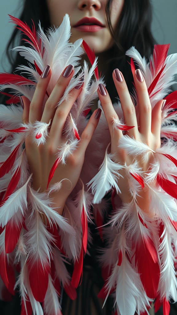 A surreal vision unfolds as the woman's hands morph into a cascade of delicate feathers, a haunting blend of white and crimson hues. These feathers, evoking nightmarish creatures, interweave in layers reminiscent of experimental art, capturing the essence of honeycore with a whisper of dollcore innocence. The mood shifts subtly towards mallgoth, with dark undertones playing against the vibrant feathered tapestry, echoing the innovative spirit of the Gutai group's avant-garde creations. The scene is a raw, visceral display of unusual beauty, every element contributing to a dreamscape that's eerily enchanting yet beautifully strange, under the expansive aspect ratio of 21:32.