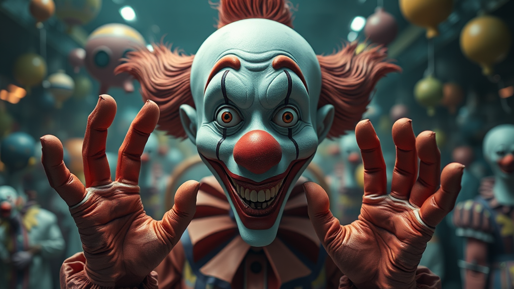 A surreal world with clown-like features in an ultra-high-definition, showcasing vivid colors and high dynamic range, featuring duplicated and mutated elements, including a cloned face with cross eyes, elongated neck, and additional fingers on mutated hands. The scene includes abstract and fragmented visuals with elements out of frame, displaying blurred details, digital noise, and remnants of compression artifacts. The image suggests a dreamlike cartoon quality with split and cropped sections, avoiding clear logos, words, or recognizable symbols.
