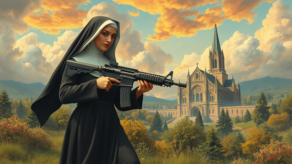 A surrealist fantasy scene featuring a serene nun dressed in a flowing habit, confidently wielding a massive machine gun. In the backdrop, a grand cathedral rises against a vibrant sky, lending an ethereal quality to the setting. The landscape around is lush and otherworldly, evoking the early 20th-century Die Brücke movement with its bold colors and dreamlike essence. The overall atmosphere blends the mystical with the surreal, creating an intriguing juxtaposition of peace and power.