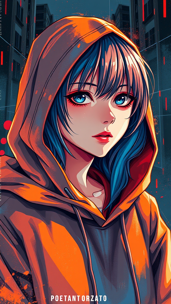 A surrealist masterpiece featuring a highly detailed portrait painting of an anime-style girl, set in an epic composition with dynamic lighting. She wears a hoodie depicted with hard brush strokes, blending an orange and blue color palette with saturated reds and blues. The artwork is infused with a binary code effect and a layered painting texture, incorporating heavy inking for depth. Pixels and a hypercube structure add a digital dimension, with an intricate pixelsort technique. The overall image achieves epic proportions, ready to be featured on art platforms like Pixiv, presented in HD quality for a vibrant and captivating visual experience.