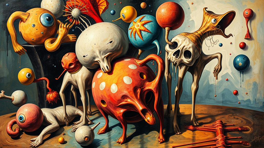 A surrealist painting inspired by Pablo Picasso, featuring striking and bizarre imagery with elements of distortion and fluid movement, objects appear as if they are dripping and melting, surreal forms intertwining in an abstract dance of colors and shapes.