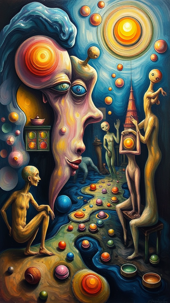 A surrealistic painting by Pablo Picasso featuring vivid and uncanny imagery, where forms are fluid and distorted, colors blend and flow like melted wax, creating an otherworldly atmosphere. The scene evokes a dreamscape with abstract figures and exaggerated proportions, invoking a sense of curiosity and intrigue.