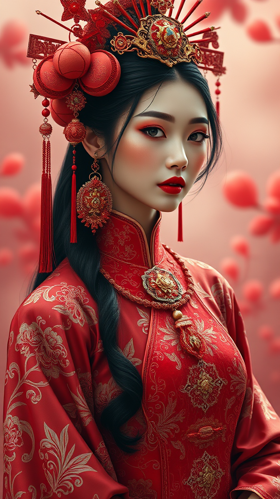 A surrealistic portrait of a feminine figure adorned in a Ming Dynasty-inspired costume, rich in symbolism and exuding affluence, set against a backdrop of Indonesian art influences. The imagery showcases a blend of red, hyper-realistic, illusionary elements that transcend into a 4D-like dimension, with ultra-detailed and high-quality digital art. The scene is cinematic, capturing the essence of hyper-detailed reality in every stitch and pattern of the attire, all portrayed in a mesmerizing and hyper-realistic style.