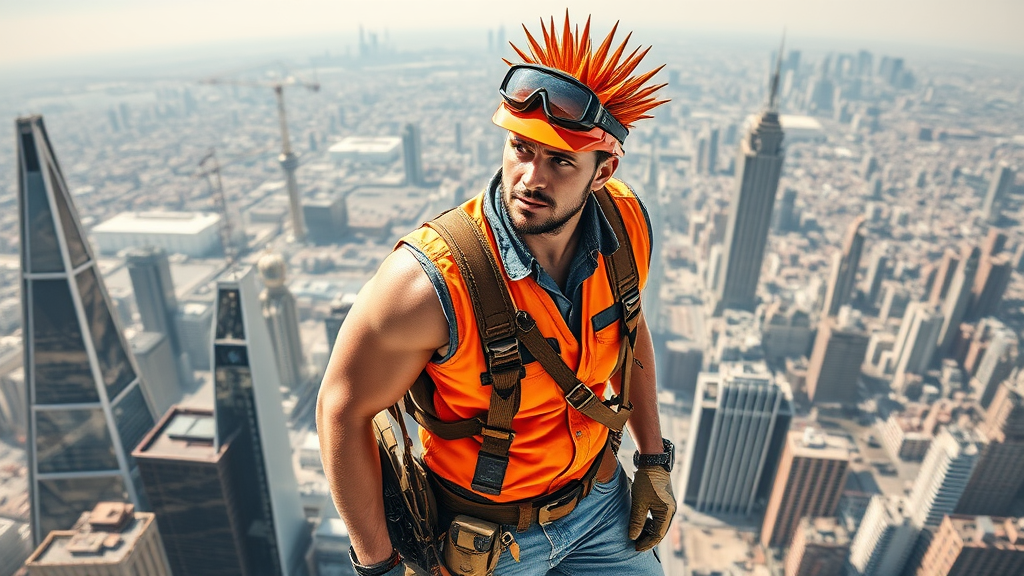 A swashbuckling construction worker in a punk-rock riot of a hard hat, with safety goggles perched atop a spiky, mohawk-like stack to exude a rebellious spirit, arises atop a sleek, modern skyscraper as the cityscape sprawls beneath like a majestic canvas of architecture and humanity. The worker's physique is a chiseled testament to his unyielding work ethic, accentuated by bold, angular lines and rich textures that seem to leap off the page. His well-worn jeans and high-vis vest jacket, replete with every button, seam, and thread, are as realistically rendered as the clockwork precision of the construction equipment arrayed around him. The intensity of the midday sun beats down upon him, casting a latticework of shadows that add depth and dimension to his rugged face, set with a resolute jaw and piercing gaze that commands respect. Every individual screw, bolt, and rivet on his safety harness and equipment is lovingly detailed in a testament to his by-the-book diligence. The city itself is a vibrant tapestry of color and texture, with a deep, foreboding sky glowing like a furnace behind the towering skyscrapers, whose steel and glass exteriors glint like a billion tiny mirrors. The whole scene comes alive with an energy that's almost palpable, exuding a sense of awe-inspiring heroism that belies the humble origins of this unsung champion of the working class.