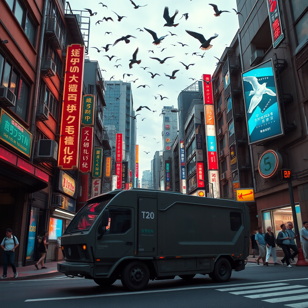 A sweeping panoramic view of a bustling city street reminiscent of Tokyo, where the architecture shows signs of age yet is interspersed with futuristic touches—neon lights casting vibrant hues and holographic ads shimmering intermittently. Above, a cacophony of birds flutters swiftly across the skyline, while below, a sleek, automated garbage truck glides smoothly by, its passage reverberating slightly. The atmosphere is a blend of the nostalgic and the avant-garde, capturing a moment in a city where the past and future coexist seamlessly.