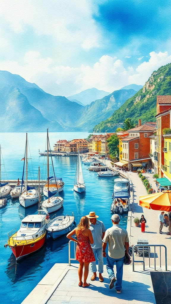A sweeping vista of Riva del Garda, capturing the charm of a Mediterranean Italian harbor scene, rendered on textured paper with a watercolor vignette. The scene is imbued with a dreamy ambiance, vibrant and luminous hues, capturing intricate details with gentle lighting. The artwork possesses a master artist's touch yet incorporates deliberately mundane graphics, juxtaposing high artistry with a low-resolution aesthetic. The portrayal of people features intentionally flawed anatomy, adding an element of whimsical imperfection to the bright and lively harbor landscape.