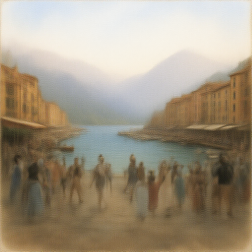 A sweeping vista of Riva del Garda, capturing the essence of a Mediterranean Italian harbor scene through a wet-on-paper watercolor vignette, exuding a dreamlike ambiance with vibrant and luminous colors. Delicate details unfold under gentle, soft lighting, reminiscent of a master artist's touch, yet paradoxically paired with mundane, low-resolution graphics. The depiction includes figures with curious, abstract anatomy, adding to the surreal, low-quality charm of the image.
