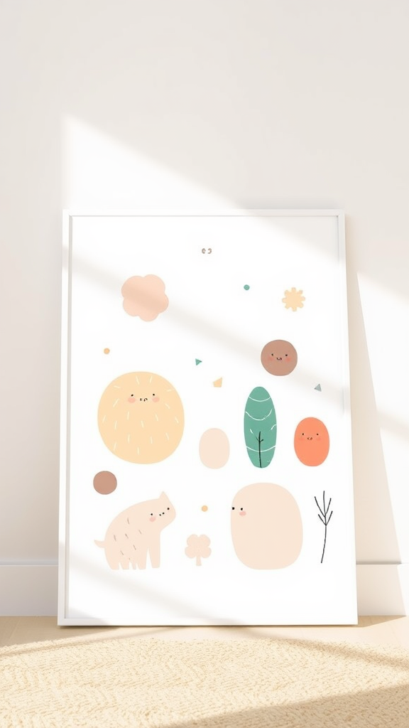 A sweet illustration featuring charming clipart of simple organic shapes, inspired by Jon Klassen’s distinctive style, utilizing a soft, light, and airy pastel color palette. Designed as nursery art, it rests on a clean white background, offering a whimsical and gentle aesthetic suitable for a child’s room.