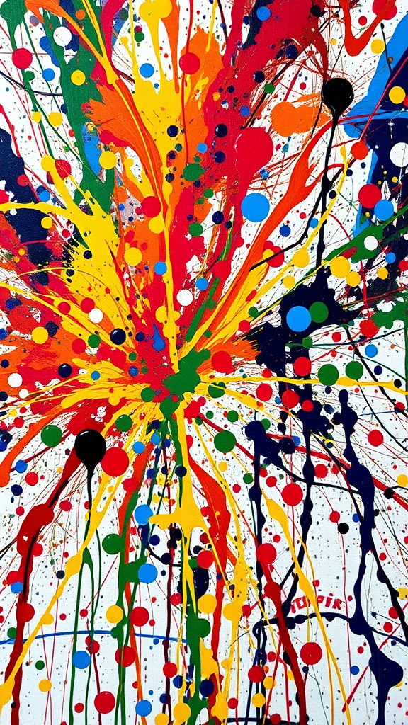 A swirling cascade of vibrant colors captures the passionate essence of an abstract artist, paint splatters forming an image that embodies the chaotic brilliance of creation, each stroke revealing a glimpse into the tumultuous mind of a visionary, the canvas alive with dynamic energy and raw expression, echoing the spirit of Jackson Pollock.