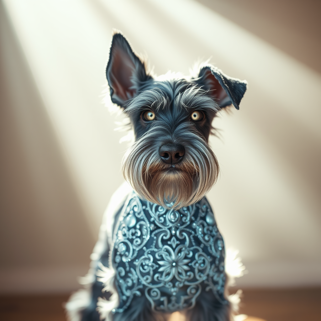 A symmetrical, luminous, majestic schnauzer with metallic, anodized fur, radiant moonlit eyes that pulse with an inner glow, enveloped by delicate, lacy, glittering metallic filigree that appears to be crafted from intricate, swirling patterns of hoarfrost, standing in a sunbeam that casts an ethereal glow on the surrounding environment, amidst a backdrop of soft, diffused light that accentuates the subtle, intricate details of the dog's fur and the delicate lacework that adorns its body, created with high detail in 8k resolution, evoking a dreamlike, surreal atmosphere reminiscent of fantasy and mysticism, lit with soft, gentle, and even lighting that draws the viewer's eye into the intricate world and details of the majestic, otherworldly schnauzer.