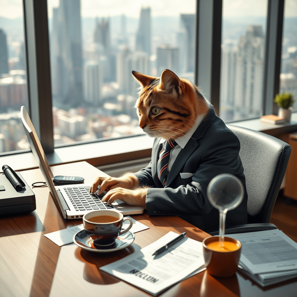 A tabby cat dressed in business attire, sitting at a modern office desk, typing on a sleek laptop, surrounded by paperwork and a steaming cup of coffee, photorealistic, high detail, artistic masterpiece in ultra high definition. The office has a large window with a view of a bustling city skyline, sunlight streaming in, creating a warm, productive atmosphere. The cat's expression is focused and determined, blending seamlessly into the human work environment, adding an imaginative touch to a classic workspace scenario.