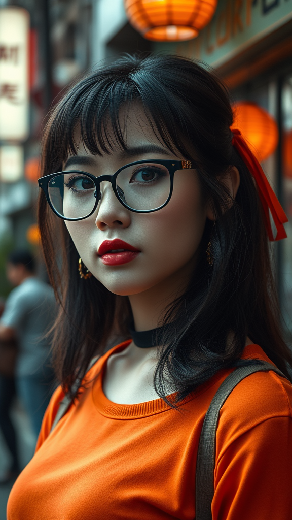 A Taiwan-inspired aesthetic featuring a woman reminiscent of Velma from Scooby-Doo, wearing eyeglasses and an orange top. She embodies a goth style with dark eye makeup, portrayed in the evocative style of Jessica Drossin. The scene combines kitsch elements, a nod to Kieron Gillen's storytelling flair, and golden age aesthetics with Dima Dmitriev's attention to life-size figures. Influences of catcore subtly weave into the scene, creating a unique blend of cultural references and artistic styles.