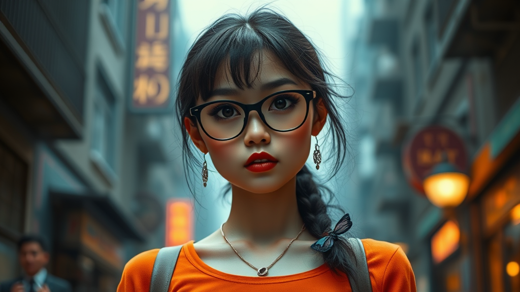 A Taiwanese girl with Velma from Scooby-Doo's charm, adorned with stylish eyeglasses and a vibrant orange top, exudes a goth-like aura with dark eye makeup. Her look blends the rich, cinematic textures of Jessica Drossin with a playful kitsch twist and the artistic flair of Kieron Gillen. She stands as a life-size figure, echoing the golden age aesthetics and the whimsical influence of Dima Dmitriev. Her presence is subtly infused with catcore elements, adding a layer of mystery and allure, all set in a captivating scene reminiscent of a fantastical illustration.