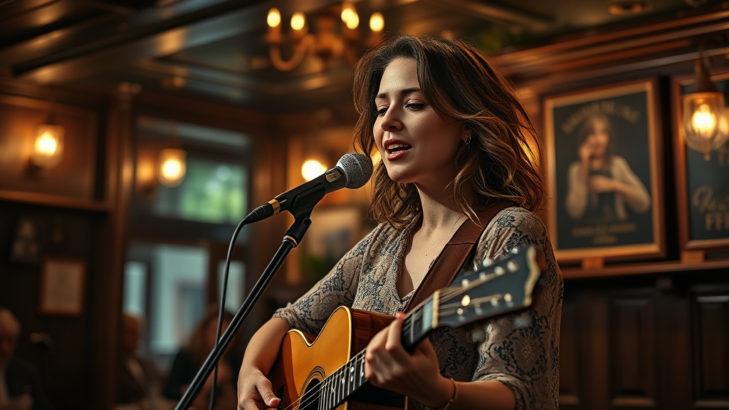 A talented female singer-songwriter graces the stage of a charming, dimly lit pub, exuding charisma as she delivers emotive ballads that resonate through the crowd with her soulful voice. Captured in an 8K resolution RAW image with a Canon EOS 5D Mark IV, the scene reveals intricate details and textures in a fine-art print style. The high-quality, high-resolution image features cinematic lighting that highlights the singer's expressive face and the intricate weave of her outfit. The photograph showcases an award-winning level of artistry, with sharp, clean focus and a crystal-clear atmosphere that captures the intimate ambiance. The texture of the wooden stage and soft glow from the vintage lamps contribute to a hyper-detailed, hyper-maximalist visual, perfect for magazine or advertising photography, with high-definition quality and impeccable shading that enhances every element of the scene.