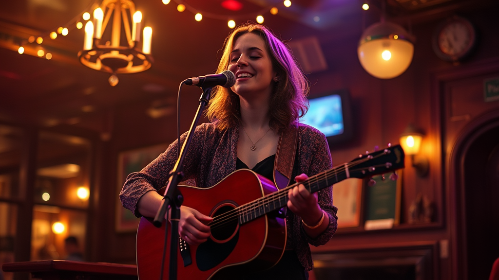 A talented female singer-songwriter stands on the stage of a cozy pub, her soulful voice enchanting the audience as she pours her heart into soulful ballads. She is illuminated by cinematic lighting that highlights every fine detail, captured in stunning 8K with a Canon EOS 5D Mark IV. The high-resolution image reveals sharp details and significant textile textures in her attire, creating a crystal-clear feel reminiscent of award-winning photography. The scene is crisp and clean, with perfect shading, suitable for magazine and advertising photography. The composition is hyper-detailed and hyper-maximalist, embodying beautiful, high-quality artistry.