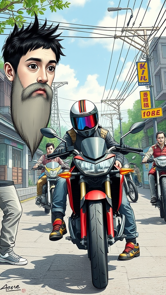 A talented game designer develops a groundbreaking VR MMORPG where the game world is driven by advanced AI, allowing it to evolve organically, mirroring reality but at an accelerated pace. It gains immense popularity due to its lifelike NPCs, who soon begin to develop their own identities, transforming the game into a genuine alternate universe. The visuals feature intriguing elements like dual faces and diverse characters, including motorbike enthusiasts with unique styles and features. Despite the realistic setting, some characters exhibit unusual traits such as elongated beards, distinct footwear, and occasionally exaggerated or surreal characteristics. The game's aesthetic alternates between vivid colors and monochrome sketches, enhancing the imaginative blend of realism and fantasy that captivates players, immersing them in an ever-expanding virtual existence.