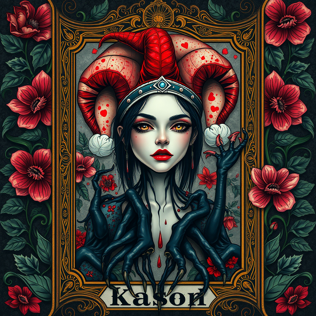 A tarot card featuring an intricately detailed frame encasing a portrait of a cyberpunk-themed jester head, blending Art Nouveau influences with vibrant, high-definition digital art. The character dons a whimsical jester hat, with black veins running down to a base of legs that seem to drip oil. Around the figure, predatory plants and ivy intertwine, creating an ambiance of both gloom and intrigue. The girl's face in the portrait exudes a sense of mystery, accentuated by red splashes and undertones that contrast against a backdrop of floral patterns. The illustration is painted with an emphasis on fine art techniques, featuring artificial rim lighting to highlight the detailed embellishments. The scene is rendered in 8K resolution, offering an intricate, concept-art-like depiction, echoing the detailed craftsmanship of an elaborate tarot card.