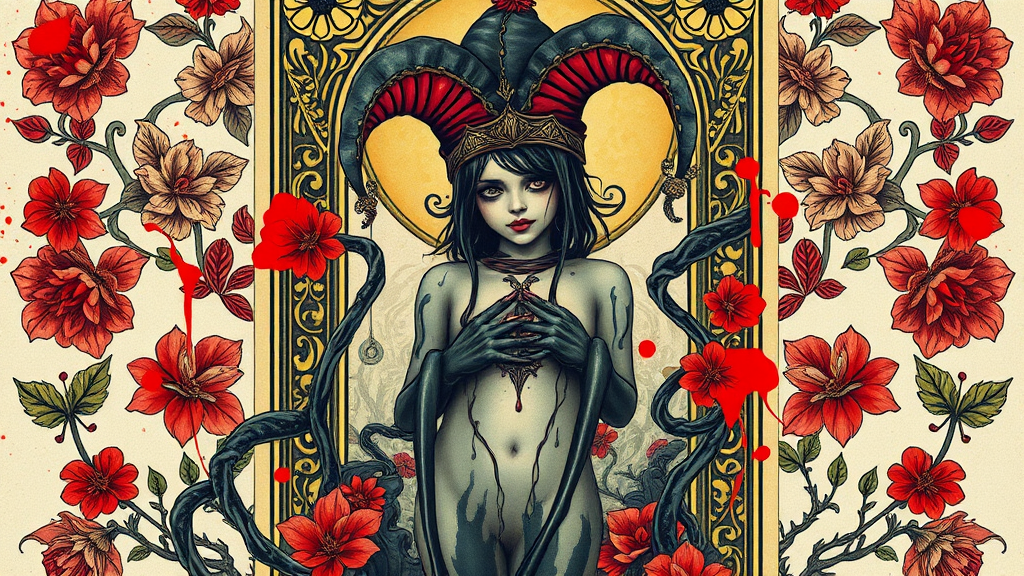 A tarot card featuring an intricately detailed frame enveloping the portrait of a cyberpunk figure donning a jester hat, styled with Art Nouveau influences, showcasing vibrant and insanely detailed embellishments. The cyberpunk aesthetic merges with high-definition concept art, featuring a focus on intricate details. The character stands with legs exhibiting black veins and dripping oil, surrounded by predatory plants and winding ivy. The face of a girl appears amidst a gloomy atmosphere, accentuated by red splashes and red undertones. A background floral pattern adds depth, with a harmonious blend of illustration, painting, and fine art elements. The image is captured with an 8K resolution, and the lighting consists of both rim and artificial lighting, maintaining an aspect ratio of 1:2.