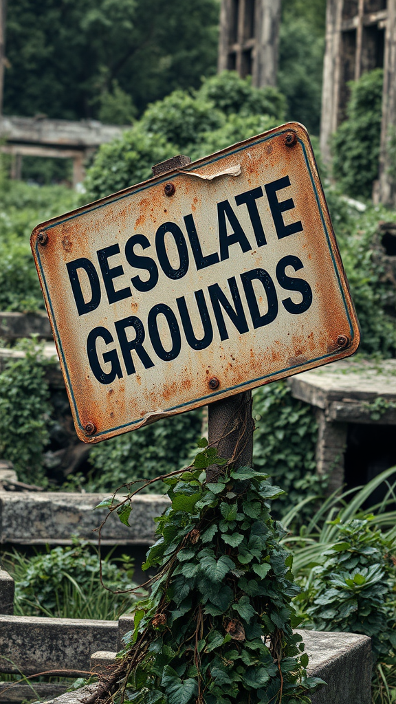 A tattered and rusted metal sign stands amidst the overgrown ruins, bearing the faded and peeling words "Desolate Grounds". Bullet holes and scorch marks mar its surface, hinting at the chaos that once reigned here. The sign tilts precariously atop a post overrun with ivy and thorny vines, blending into the desolate landscape. Frayed edges whisper tales of a world left behind, as the wind carries dust across its worn lettering, echoing memories of abandonment.